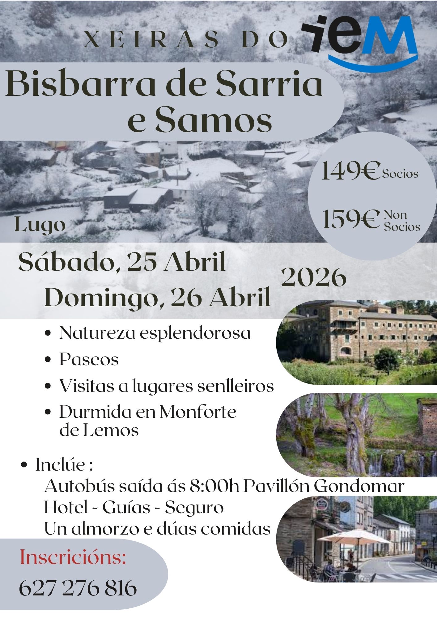 O vindeiro 25/26 de Abril 2026, comezamos cunha nova Xeira do IEM de dous días e unha noite. Visitaremos a Bisbarra de Sarria, concello de Samos. Coma sempre disfrutaremos dunha natureza esplendorosa, con paseos e visitas a lugares senlleiros.